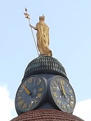 | Gold colored "Goddess of Justice" and a four-sided clock adorn the courthouse dome. | ![]() |