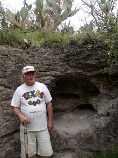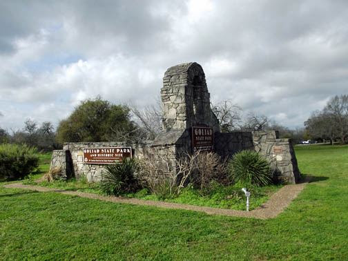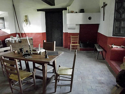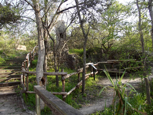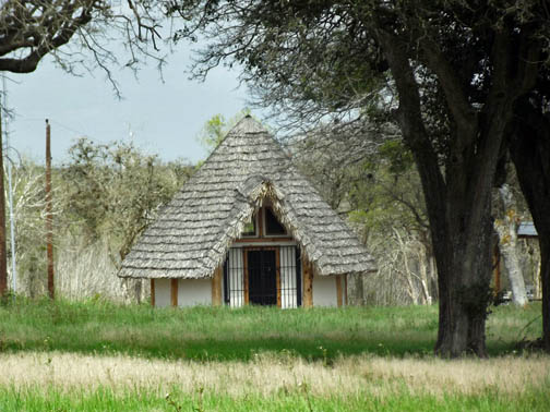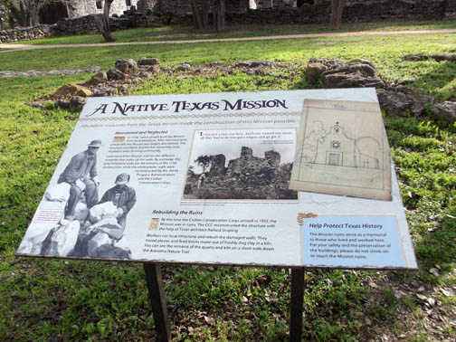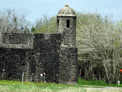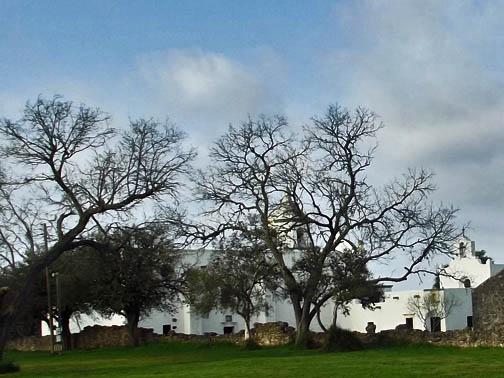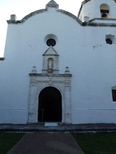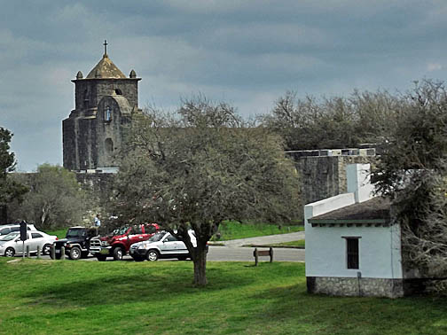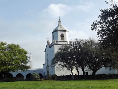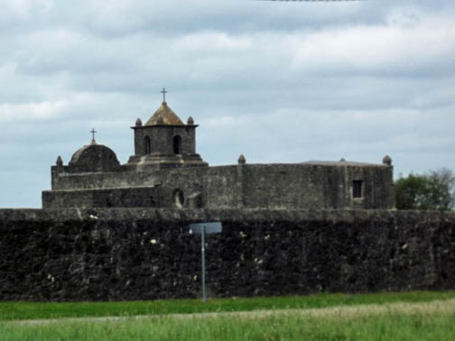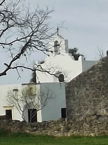 | Mission Espiritu Santo appears when we come out of the trees. |