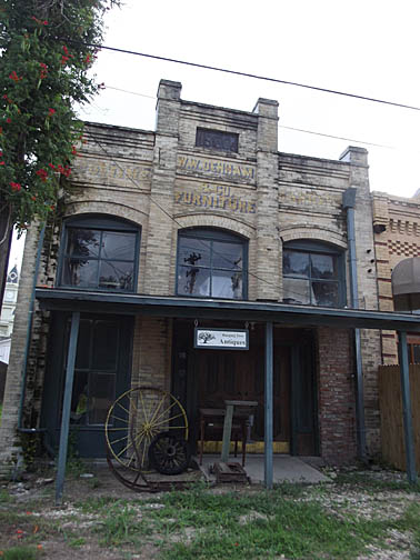 | Faded sign on building says furniture store. It also says coffins. |