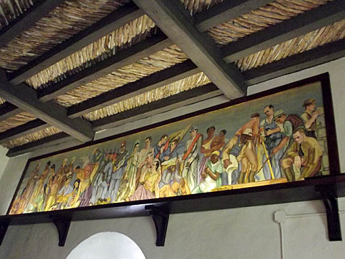 | Last time we walked here I missed this mural hanging high up on the wall. It is a WPA era mural that once hung in the Capitol Building at Austin. “The Pageant of Texas” by artist Harold Everett “Bubi” Jessen. |