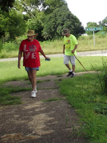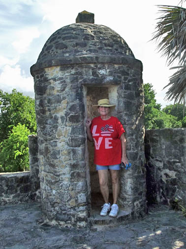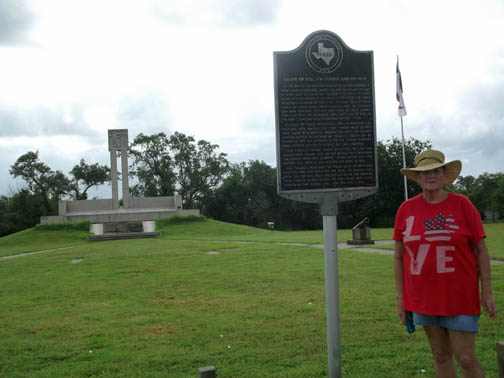 | Carol and the monument at the grave of Texan Army Col. James Fannin and his men, who were captured at Goliad and executed en masse here on Palm Sunday, 27 Mar 1836, one of the bloodiest days of the Texas War for Independence. |