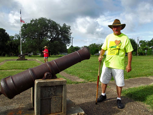 | Ed with one of the two cannons that line the walkway. The cannons are fixed in place, mounted on concrete pedestals in which the Lone Star flag of Texas is embossed. |