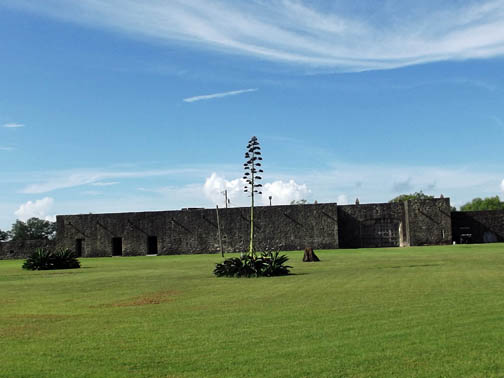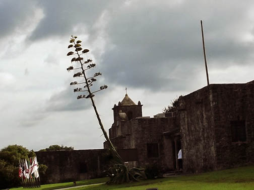 | Blooming Century Plant in front of Presidio La Bahia. It is a Spanish fort originally built in 1749. It is not part of Goliad State Park and it requires an additional admission price to enter. |