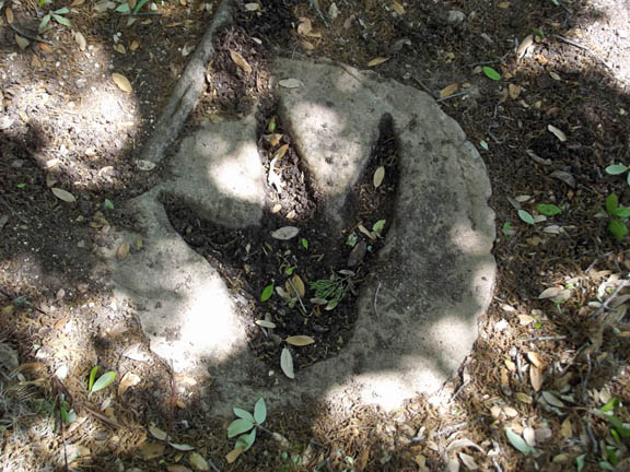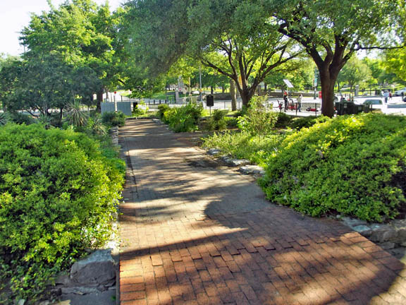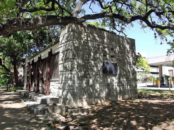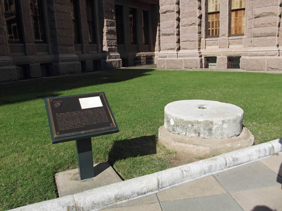 | The foundation stones of the temporary Texas State Capitol of the 1880s are pretty well hidden by the landscape plants. |