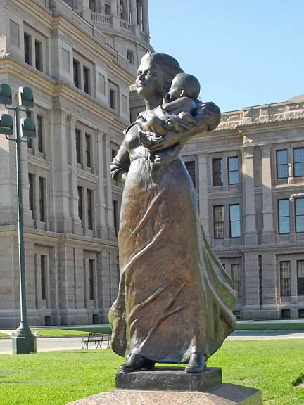 A life-size bronze sculpture of a young Texas pioneer mother with a baby on her arms. |