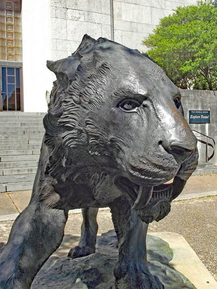 | Sabre Tooth sculpture stands guard in front of the Texas Memorial Museum. |
