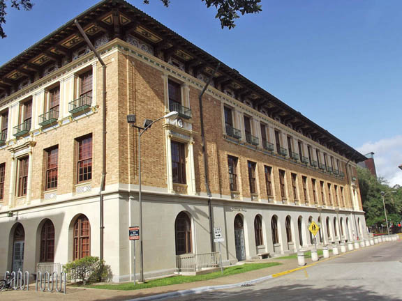| Sutton Hall has tile roofs; broad, bracketed eaves enlivened by color; and glazed terra cotta ornament. |