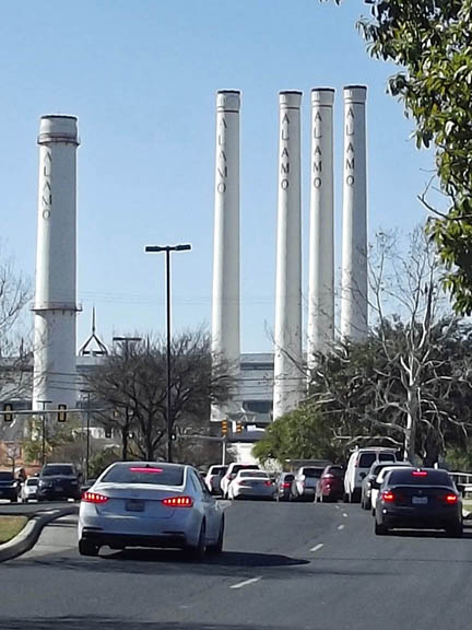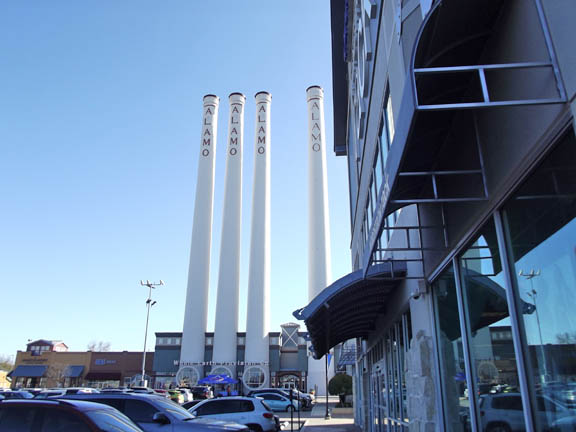 Smokestacks left over from the cement plant days still mark the Quarry Market Shopping Center.