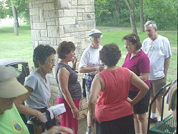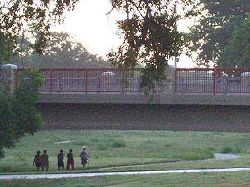 | Jan leading the walkers ahead of us as they pass under bridge. |
